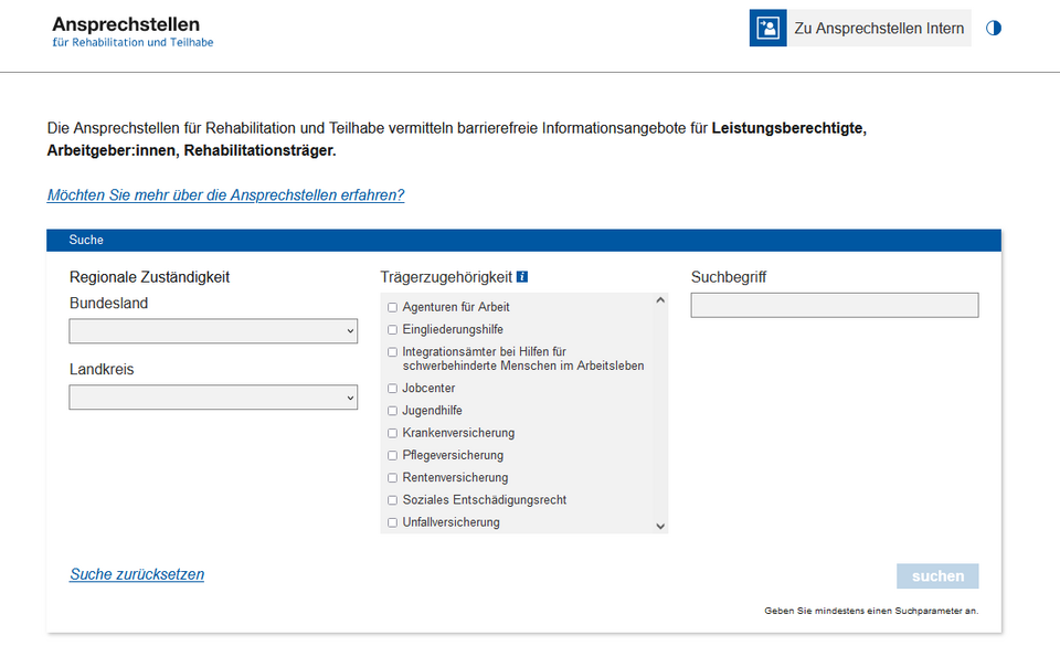 Ansprechstellen Intern ist ein passwortgeschützter Bereich innerhalb www.ansprechstellen.de, der ausschließlich Mitarbeitenden der Reha- und Sozialleistungsträger zur Verfügung steht. Hier finden Sie neben den offiziell veröffentlichten Kontaktdaten der Ansprechstellen auch spezifischere Kontaktdaten von Mitarbeitenden der Reha- und Sozialleistungsträger.
